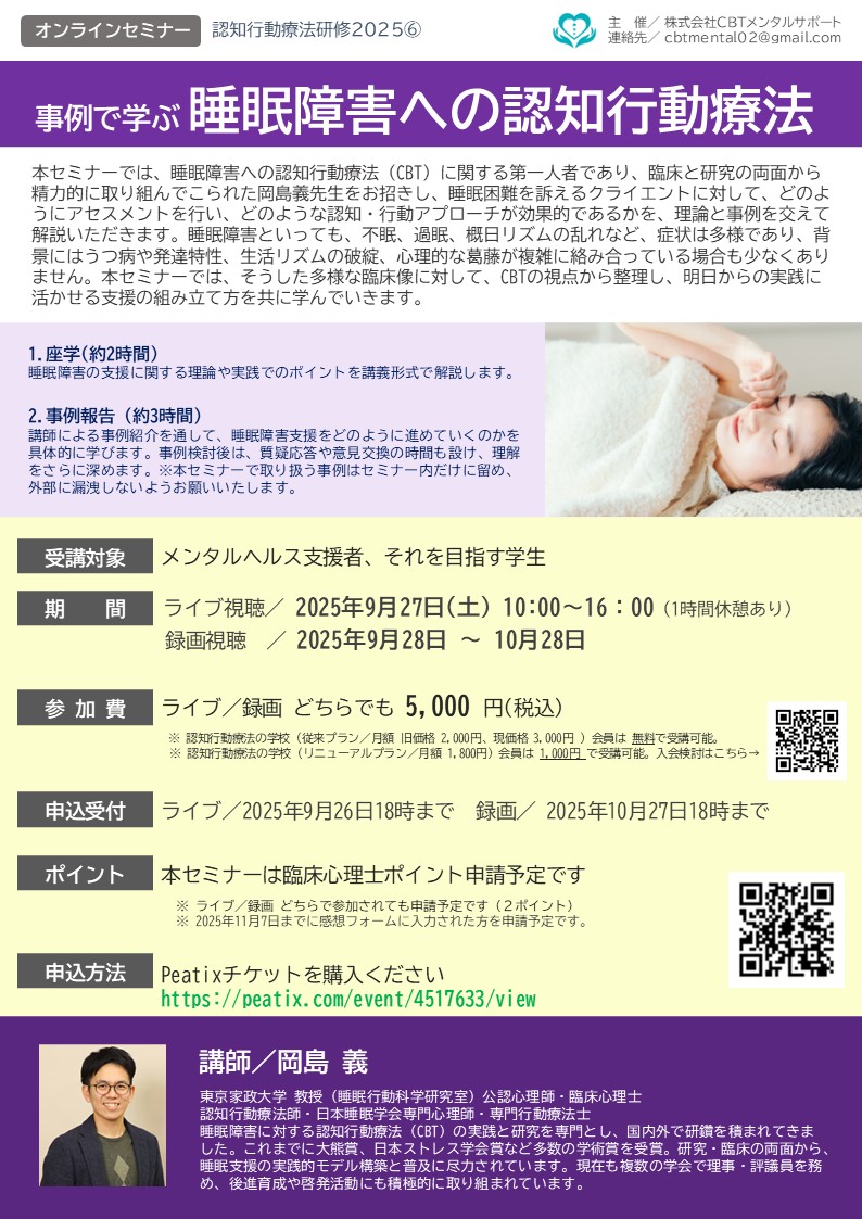【認知行動療法研修2025⑥】事例で学ぶ 睡眠障害への認知行動療法