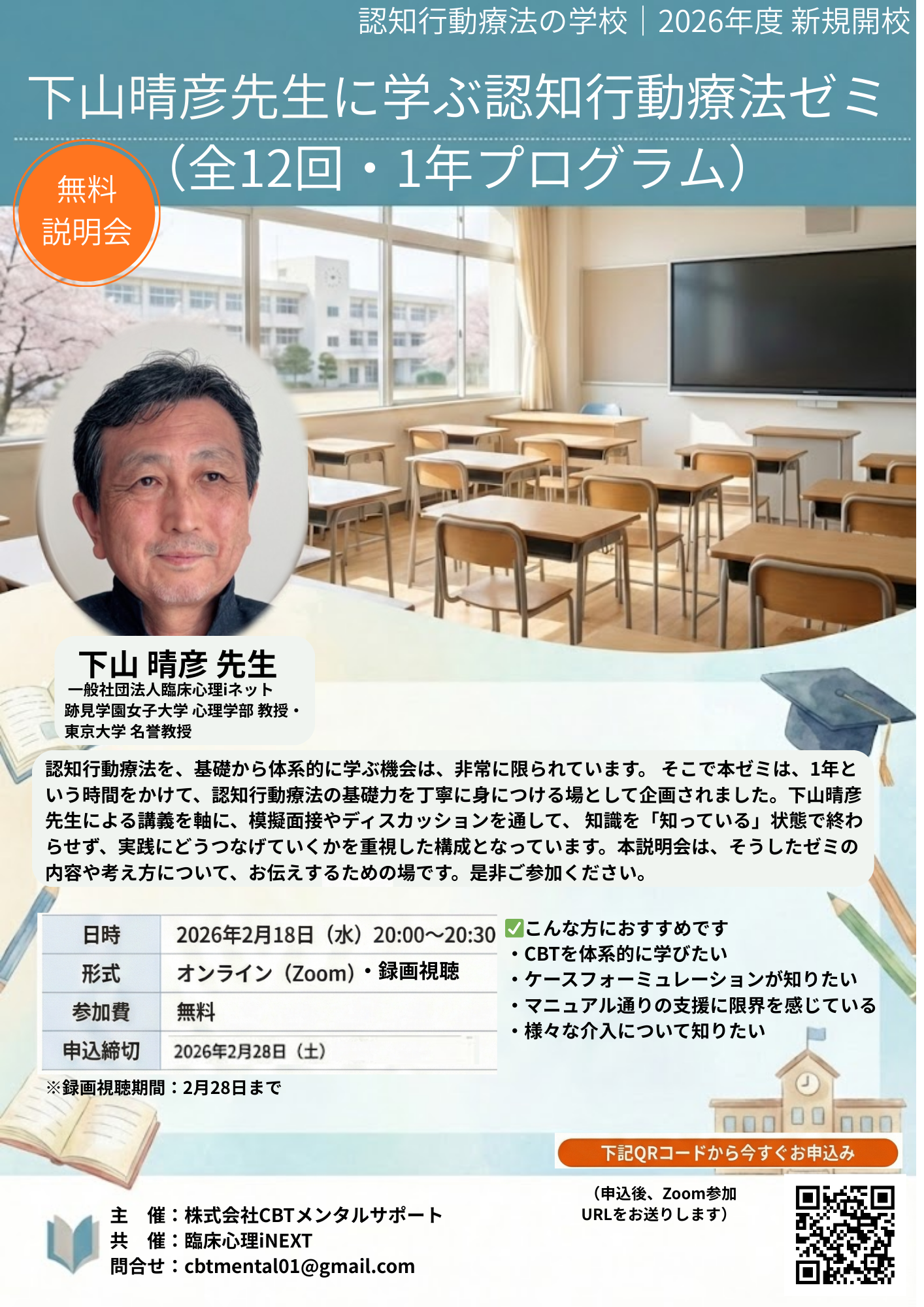 【無料説明会】下山晴彦先生に学ぶ認知行動療法ゼミ(全12回)開講に向けたオンライン説明会(全12回・1年プログラム)
